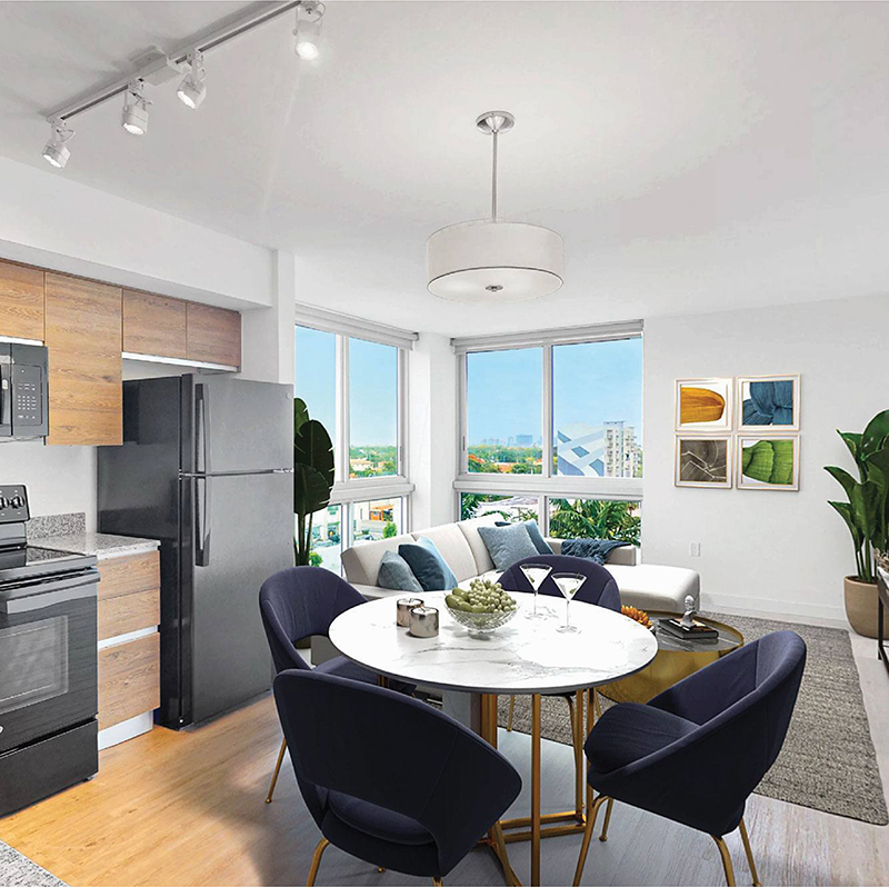 Douglas Enclave is an 11-story, 199-unit building with brand-new Little Havana apartments available for rent. It includes a thoughtful mix of studio apartments, one-bedrooms, two-bedrooms and townhomes for rent. Individual apartments feature vinyl-wood flooring, open-concept kitchens, stackable washer/dryer units and efficient appliances.